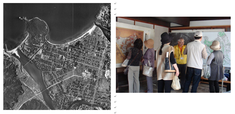 今年の古写真班のパネル展示は「萩城下町絵図」「米軍撮影の萩三角州の航空写真」「夏みかん畑の分布図(1952年)」